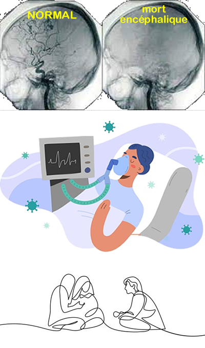 Mort encéphalique du patient : La mort encéphalique correspond à une perte irréversible des fonctions encéphaliques, en particulier celles du tronc cérébral. Elle se définit par un arrêt définitif de l'activité cérébrale suite à une privation d'oxygénation du cerveau par manque de circulation sanguine. Plusieurs causes sont possibles : Traumatisme cranien ( accident) - AVC total - noyade - arrêt cardiaque ...Le décès est prononcé par 2 médecins différents à 4 heures d'intervalle : Electro-encéphalogramme plat ou angio-scanner